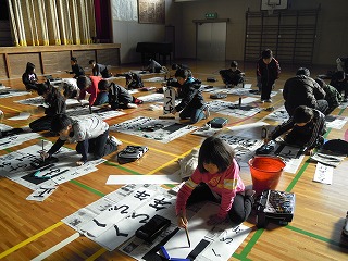 「始めましょう」の声に、最初は筆の動きが遅かった3・4年生ですが、気持ちを込めて書き始めると、真剣に、シーンとした雰囲気の中、描き初めを各自進めていました。出来上がった作品は立派なものばかりでした。