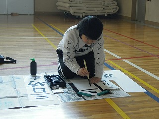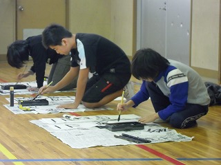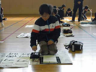 予定とおり、昨日9日(水)に3・4年(12限)、5・6限(34限)体育館で書き初め大会を行いました。