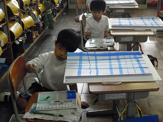 先週木曜日にいつものように授業を眺めにまわっていると、1年生が全員机の下に隠れているような姿勢になっていました。この時期に、独自に避難訓練?と不思議に思って、教室にはいると、絵の具の水をこぼさないようにという配慮で、絵を机の上に、パレットをイスの上に、そして、水を床に…と区分けをして、画用紙には思い思いの色で、太いものから極細のものまで、直線を絵の具で描いていました。一つの基本の練習なのでしょうね!!!子どもたちは、笑顔で、かつ真剣に取り組んでいました。その姿に、感激しました。