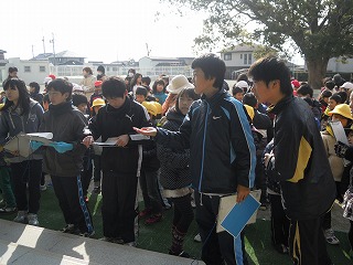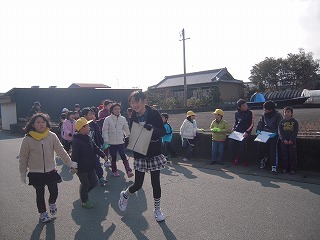 晴れた風の冷たい今日、予定通り、縦割り班で「児童会ウォークラリー」を東大淀町内で行いました。時間通りにゴールをめざし、各チェックポイントで(本当はクイズ等をする)シールをゲットしてくる活動です。