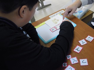 そんな中、くすの木1学級では、3名が「ことば」の学習を楽しそうに、また、真剣にしています。「せ」で始まる言葉・終わる言葉を順に言ったり、しりとりをしたり、文字と絵合わせ(マッチング)をしたり、同じ学年の漢字ドリルをしたり、と3名全員でする学びと個々の学びを上手に取り合わせて、一日1限の「ことば」の学習をしています。今日は二限目に参観させてもらいました。写真は、その風景です。
