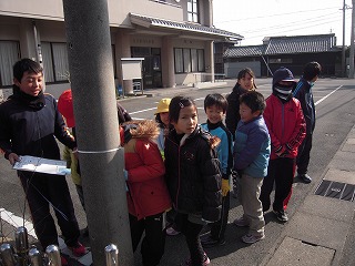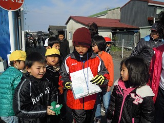 風の冷たい中、東大淀小学校の周辺の木や建物の角、電信柱の脇などにチェックポイントがあり、最終ゴールは浜、のウォークラリーです。