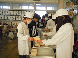 写真は、4年生と5年生の配膳風景を撮らせてもらいました。