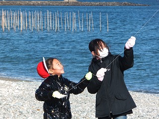浜はすばらしい北西の季節風が吹いて、何の努力もしないでも、凧の糸を少しのばすと、勢いよくどの凧も高く空へ。あとは糸をのばすだけのばし、みんな50Mの糸全開!!!笑顔と歓声が浜にはいっぱいになりました。山口教頭先生と凧つくりを指導していただいた倉本さんも協力をしていただきました。