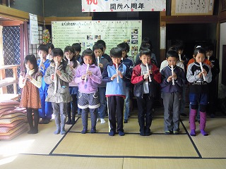 前の『校長室から』で紹介した1年生凧揚げ(6年生補助)のあった同じ時間帯に、3年生が、本校と南海か交流をしている「宅老所もんちゃん」を訪れ、数週間練習してきた 劇・紙芝居・合唱合奏を披露してきました。