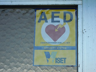 写真は、AED器、そして、玄関に貼ってあるAED設置のシールです。