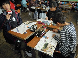 写真は、授業の初め、黒坂先生の説明を聞く2年生、背中合わせ立ちの颯也君・奨真君・真喜志君たち、新聞ゲームの理央奈さん・大翔君・星名君・謙心君 です。