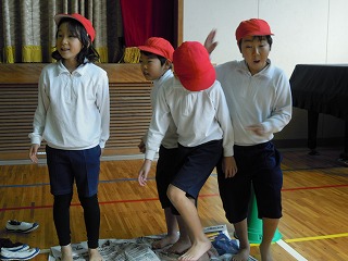 当日の内容は、「背中合わせ立ち」「子取り鬼」「新聞ゲーム」の3つで、2年生のみんなは笑顔いっぱい、時に真剣な顔で相談したりして、5分延長の50分授業をがんばりました。