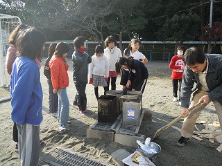 運動場の端で、炉を作り、一斗缶にぬらした新聞紙とアルミホィルに巻いたさつまいもを145名以上の分準備をして入れ、下に火を入れて蒸し焼きの感じで焼いもをします。火の番は担任の加藤先生ですが、準備や他の学年へのおすそ分けは5年生の子どもたちがはりきってしました。
