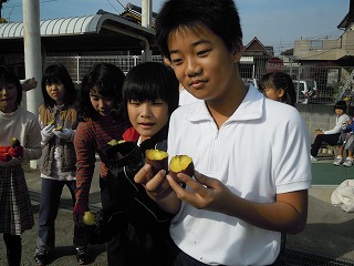 2限目と3限目の15分の休み時間に、1・2・3・4・6年生全員が出てきて、5年生が焼き上げたお芋