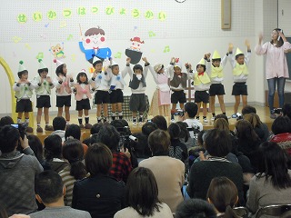 12月の初日、東大淀保育園の生活発表会を参観に行きました。多くの小学校の子どもたちも見に来ていて、驚いた顔をしたり、「校長先生」と言って近くまで走ってきてくれたり、・・・とさまざま。