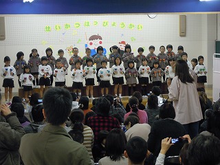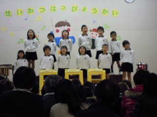 発表会は、どの組さんもすごいがんばりようで、4歳や5歳の子どもさんがこんなすごいことができるんだ、と今さらながら感動をもらいました。そして、何よりも、保護者の方々やおじいさん・おばあさんの反応がとても温かく、会場全体がほのぼのとした雰囲気で、それが園児たちをよりのびのびさせていたようです、多少の緊張感もありましたが。約2時間、ありがとうございました。イイ気持ちで帰宅しました。
