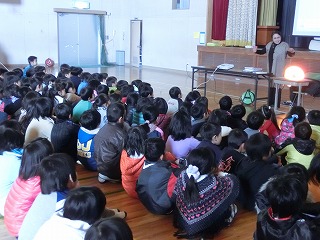 写真は、身振りたっぷりに話される橋村さん、聴き入る子どもたち です。