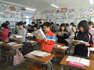 写真は、初日の早口言葉にチャレンジする1年の颯太君・慎太郎君、2年の碧衣さん、本を見せているのは6年の竜政君・晴天君、さらに本を仲間で読んでいる1年生や3・4年生 です。
