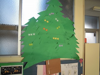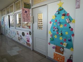 東大淀小学校には、今、3つのクリスマスツリーが子どもたちを迎えています。一つは玄関にできているツリーだけ、これから児童会を中心に飾り付けが進むと思います。どんな願いが飾られるのか、今から楽しみです。二つ目は2階くすの木学級の壁に飾られている松ぼっくりつきのきれいなクリスマスツリーです。とてもていねいに作られています。三つ目は3階図書館前のデコレーションです。これは学校支援ボランティアの3名の方々の力作です。大きなサンタさんは、「東大淀小のみんなへ、すてきなクリスマスを」と書かれた本を持って笑っています。みんな、いいクリスマスを、そして、いい毎日を、と願ってやみません。