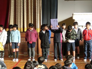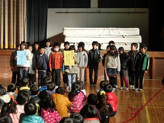 聞いていると、「そう、その思いで行こう」「みんなで実行していこうな」と思ってしまうイイ標語が出されました。『生きている 一日一日 大切に』(6年生)、『思いやりの 気持ちを 行動に』(4年生)『あいさつは ともだちになる はじめのいっぽ』(1年生)などなど。発表もクラス全員でのかけ声や呼びかけもあり、担任の先生の工夫にも感心でした。くわしくは、次号・学校だよりをご覧ください。