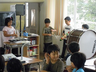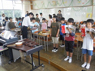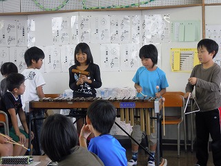写真は、授業の最初に「おかしのすきなまほう使い」を歌う3年生全員、「まほうの音」を発表する希菜里さん・翔真君・威智君・政護君、海汰君・美涼さん・未葵さん・順正君 です。