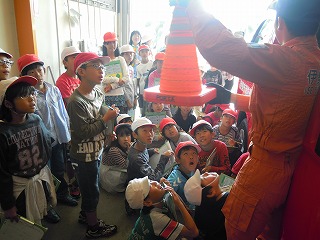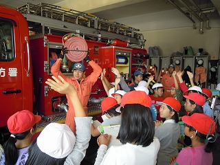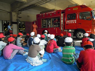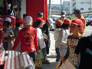 写真は、最初の説明を聴く子どもたち、救助車の周りをまわる子どもたち、そしてポンプ車のホースに関して質問をする子どもたち です。(続きは明日に)