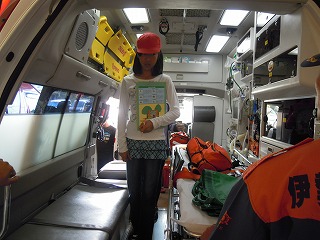 救助車、ポンプ車と見学をして、その次は、救急車です。初めてその中を見る子どもたちばかりで、ストレッチャーや救急救命機器が並ぶ中を歩かせてもらいました。その後は、指導車の説明。大掛かりな火事では、各車や各地区からくる消防車を指示指導する役の車の説明を真剣に4年生は聴きました。