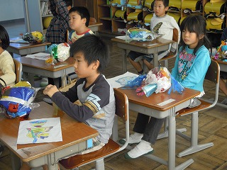写真は、1年生の「透明な袋の魚」づくり、2年生の「虹色の魚」づくり、4年生のペットボトルと粘土を使っての作品制作 です。