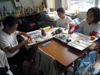 前のお知らせに続いて、4年生の制作では、ペットボトルに粘土を固めて人形や立体作品の制作に続き、「秋の果実や草花」の水彩画を描いています。
