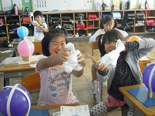 写真は、目の前に作品の基本形となる風船をおいて粘土をこねる希菜里さん・未葵さん・健太朗君・華梨さん、同様に瑠璃帆さん・暁君・海琉君・佳純さん、風船に麻縄を張った美来依さん・翔真君 です。