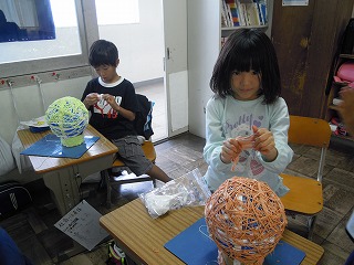 3年生は、風船をふくらませて、球形を作り、その周りを麻縄等で巻いて、その上から粘土を重ねての作品制作。最後は風船を取り除き、照明器具を入れてのランタン・部屋の照明つくりです。
