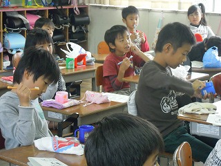 写真は、2年生全体が説明を聴いているもの、歯磨き練習の準備をする2年生 です。