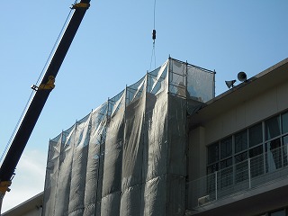 写真は、設置された新たな避難階段と渡り廊下の部品を上げる作業中のクレーン車 です。