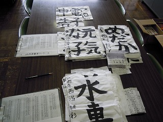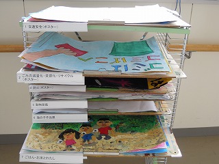 写真は、理科室に集まった理科の自由研究と工作、1階に集まった各応募ポスター作品、そして習字作品です。