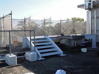 写真は、屋上から、避難階段、フェンス、渡り廊下の工事中のようす です。