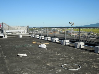 一日中雨、という日がなく、残暑の厳しい中、着々と校舎の防災工事が進んでいます。屋上へ上がってみると、東側と西側をつなぐ「渡り廊下」もできあがりつつありました。校庭からはあまり見えませんが、屋上には、写真のようにフェンスがきれいに張り巡らされています。8月末にはほぼ完成予定です。