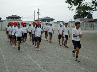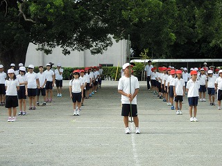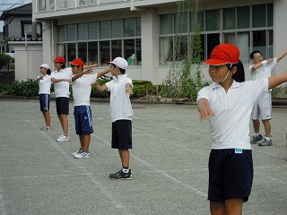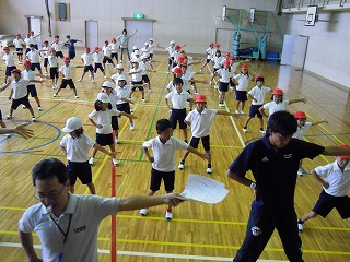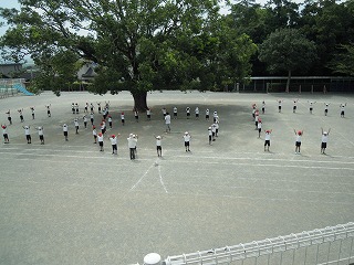 今日の一限目は全体練習。入場行進から整列、ラジオ体操を全員で「初めて」練習しました。5・6年生は落ち着いて、2・3・4年生はきびきびと、そして、