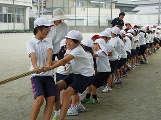 運動会の花形の一つですね。しかも、全校で赤・白に分かれて実施するので迫力があります。力の入る競技ですので、ケガをしないことを願うばかりです。つなひきは今日の練習のみ、あとは本番での勝負です。