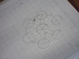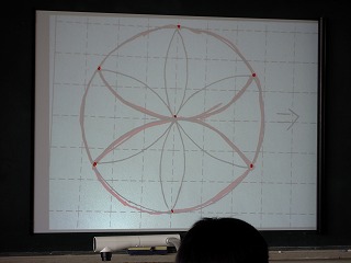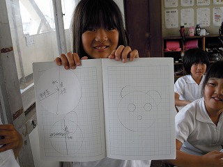 3年生の算数の授業の続きです。「円」という概念とコンパスを使って円を描く練習を重ねて、子どもたちは円を使った模様づくりに取り組みました。一人ひとりが思い思いの発想で、コンパスを使い、大きな円、小さな円を組み合わせ、幾何学的な図、動物的な図を創っていました。