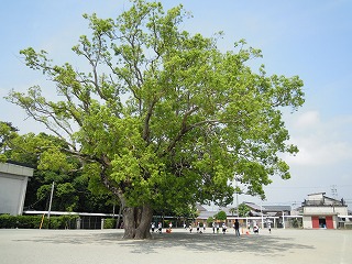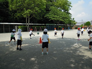 5月6月と日差しがきつくなる中、校庭のくすの木さんの木陰は、子どもたちの憩いの場でもあり、休む場でもあります。1年生の大好きな円形ドッヂ。その練習をくすの木さんの木陰を借りて行っています。3チームのうち、日向がいいと選んだチームもあり、和気藹々の体育でした。