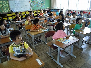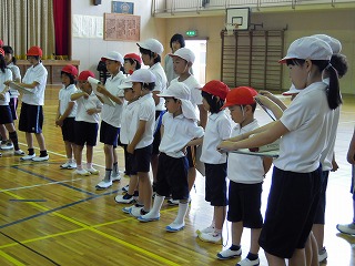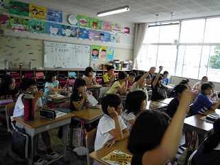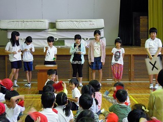 6月で3回目となる集会。今回は、各委員会の活動の発表がありました。情報掲示委員会、美化委員会、そして給食委員会。美化委員会と給食委員会は1年から6年まで興味が示すことができるような○×クイズの活動でした。私自身は、一日に東大淀小から出るゴミの量の比較的多いことや給食の残菜の量の少ないこと(子どもたちが好き嫌いを超えてよく食べていること)に驚きました。その量については、また、お家で子どもさんと話題にしてください。終わった後に、温かみの残る集会活動でした。