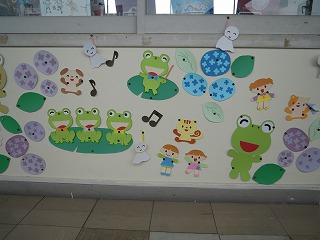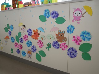 写真は、東大淀小学校玄関庭の端にきれいに咲く紫陽花と学校ボランティアの3名の方々がきれいに季節の飾りをしていただいてある図書館の壁面です。
