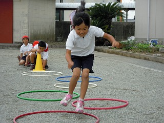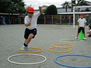 色とりどりのフラフープを地面に置き、両足でジャンプして連続で飛んでいく基本的な練習を重ねた後、黒坂先生は「グループで、連続ジャンプできる少し難しいおき方を工夫してみよう」の課題を出し、各グループが意見を出し合い、考えてのチャレンジ風景です。みんなで考える、意見を言い合うことは大事ですね。