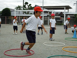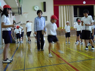 今日は2年生の体育。ジャンプ力をつけよう、リズム感をつけよう、というねらいはありますが、みんなで楽しく、明るく、元気に体を動かす活動をしています。