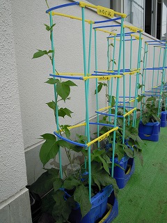 また、その隣では、1年生のアサガオのつるがすくすくと添え木に上まで伸びつつあります。