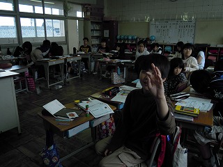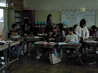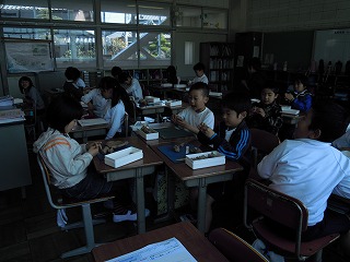 午前中に、4年算数と3年国語の授業を見ました。4年では、この間から学習している「大きな数」を実際書いてみる練習問題の授業でした。写真は、先生の机へできたプリントを持っていっている子どもさんたち
