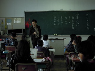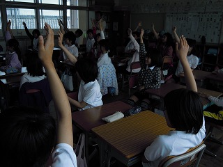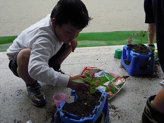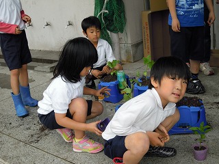 今日の2限目は、1年生のひらがなの学習。「ほ」の字を担任の先生が示すと、「一本とると「は」になる」「横をとると「ま」や」「「な」にも似とるよ」などなど。「ほ」で始まることばは?との問いかけに、「ほことたて」「ほっともっと」「ほくろう(実はふくろう」「ほーく(実はフォーク)」などの名?解答も!楽しい授業でした。次の時間は、2年生の苗植え。自分が選んだ、なす、きゅうり、ミニトマト、ピーマンを自分の鉢に土と苗を植えて完成。これまた、わいわいがやがやながら、一所懸命な活動が見られました。