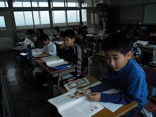 です。ミスしたお友だちを周りの仲間が教えている姿もすばらしかったです。隣の5年では、そのとき面積の求め方を、6年では円の面積の求め方を学習中でした。3年の国語では、「きつつきの商売」という読み物の登場人物をみんなで考える場面で、担任の先生の