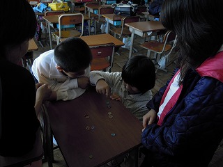 昔の遊び、おはじきや独楽、だるま落としを楽しんでいる風景です。