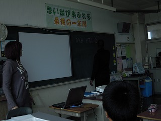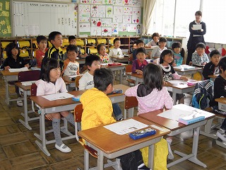 昨年度より、小学校5・6年生には、外国語活動という形で、主として英語を話す・聞く活動を担任の先生とALTジャーメイン(Jermaine)先生と行っています。今週水曜日は初の外国語活動の授業でした。アルファベットの読み方等を練習した後、自分の名前を英語で書く練習を、さらに6年生は、「いくつ?」の応答の授業でした。みんな、興味深々!!!