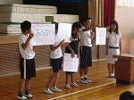 委員会の発表では、保健委員会から「学校の中であぶないこと」、図書委員会からは「課題図書の紹介」、美化委員会からは「環境に関するクイズ」を行いました。