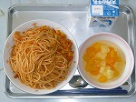今日の給食については、金曜日にお知らせしましたが、メニューを変更しました。台風が接近し、暴風警報等の発令があり、休校になった場合にも対応でき、野菜・肉なども発注やキャンセルがしやすい食材と保存がきく材料を使ってのメニューになります。今日の場合は、スパゲティ・フルーツポンチ・牛乳でしたが、1年生に聞くと「おいしい」とのことで、おかわりもたくさんしていました。