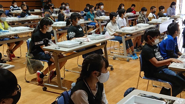 修学旅行2日目。全員そろって朝食です。目玉焼きの陶板焼きがついて豪華です。飲み物は、麦茶、牛乳、オレンジジュースから選べます。夕飯の時、食べ過ぎた人が何人かいたので、自分の適量を考えて食べるように話しがあってから「いただきます」をしました。