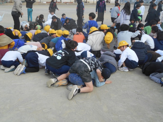 今年度3回目の避難訓練をしました。これまでは、授業時間に「火事」と「地震」で実施してきましたが、災害はいつ起こるか分からないということで、今回は休憩時間に「地震」の想定で実施しました。運動場で遊んでいる子どもも多く、その子どもたちは運動場の中央に集まって姿勢を低くして避難体勢を取っていました。いつ起こるか分からない災害に対して、自分の身は自分で守る意識をもつように話をしました。